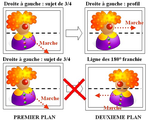Dans un cas très simple, celui d’une personne se déplaçant de gauche à droite dans le premier plan. Si pour le plan suivant, la caméra ne dépasse pas l’axe de 180° établit par rapport à la direction du mouvement, tout va bien. Si par contre pour ce deuxième plan la caméra est placée au delà de cet axe, le spectateur aura l’impression que le mouvement s’est inversé et que le personnage se déplace désormais de droite à gauche ! La question : mais comment a-t-il fait?